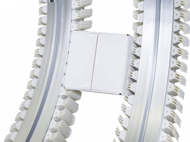 夾持輸送機(jī)由2臺(tái)相互平行的FlexMove輸送機(jī)組成,利用聚氨酯夾緊鏈板楔夾住產(chǎn)品的兩側(cè)實(shí)現(xiàn)垂直升降。